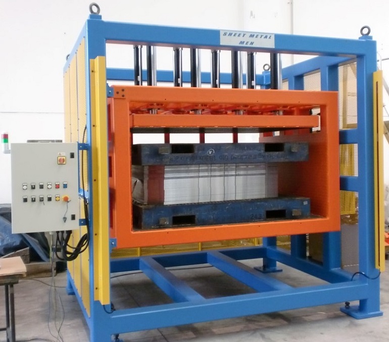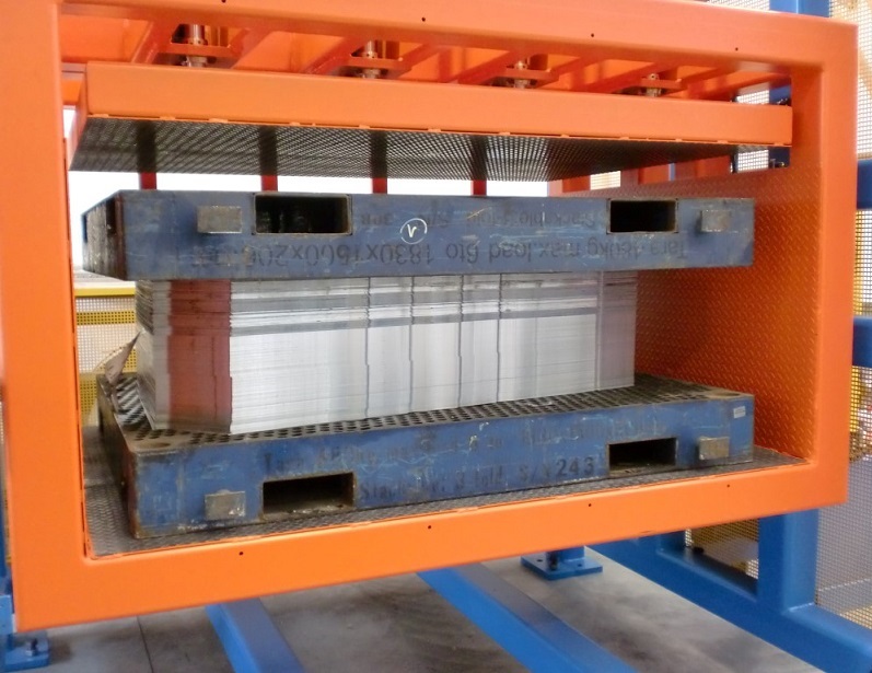 Macchina per eseguire il rovesciamento di pacchi di lamiere su pallets.